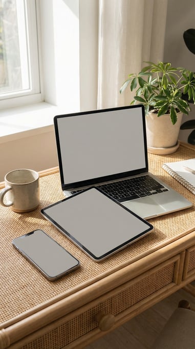 Three devices — phone tablet and laptop — arranged on a rattan desk