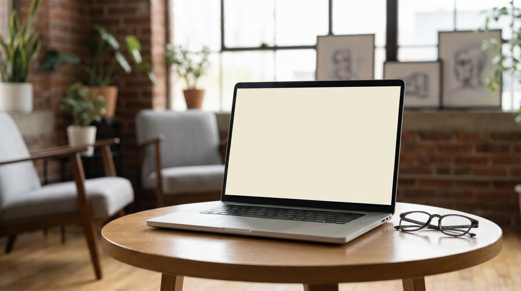 premium laptop on a round wooden side table, blank solid cream screen with no content or UI, creative agency office, soft diffused studio lighting, slight bird-eye perspective, eyeglasses resting beside, editorial product photography.