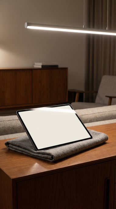 pro tablet on a folded grey cloth, blank solid bone white screen with no content or UI, mid-century modern room, bright overhead strip lighting, slight side angle, reflection on surface, editorial product photography.