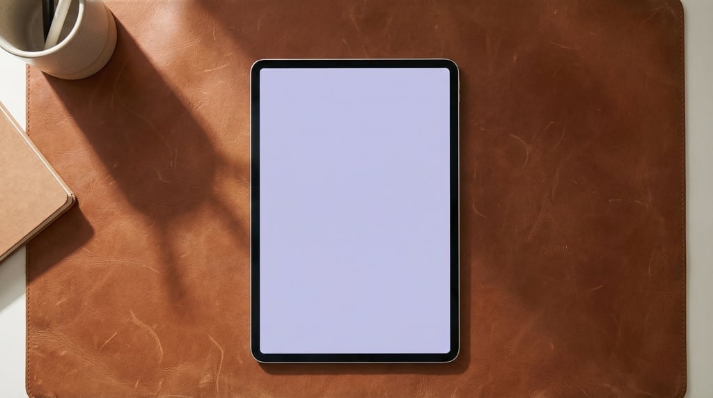 tablet lying flat on a leather desk pad, blank solid pale lilac screen with no content, overhead flat lay perspective, natural side lighting casting long shadows, minimal editorial mockup photography.