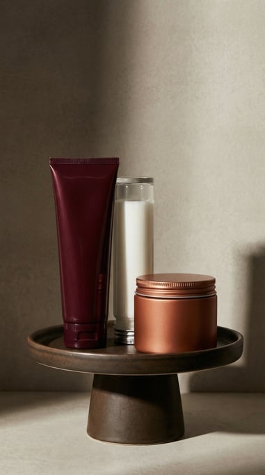 squeeze tube in glossy burgundy and cosmetic tube in clear glass and wide-mouth jar in matte copper, arranged together on a smooth ceramic surface, all completely blank with no text labels or branding, dramatic side lighting, editorial product photography.